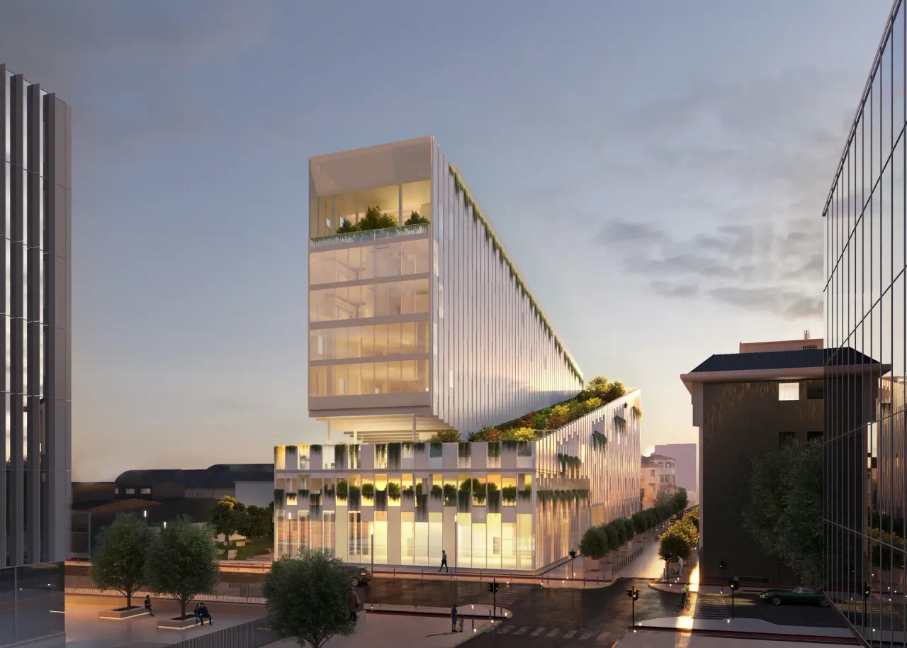 Along this green path, covered by a pergola draped with vines, one can stroll alongside a series of terraces and greenhouses intended for urban agriculture and hydroponic cultivation. Inspired by the principles of biophilic design, the project aims to achieve WELL Gold and LEED Platinum certifications, placing a particular emphasis on sustainability and occupant well-being.