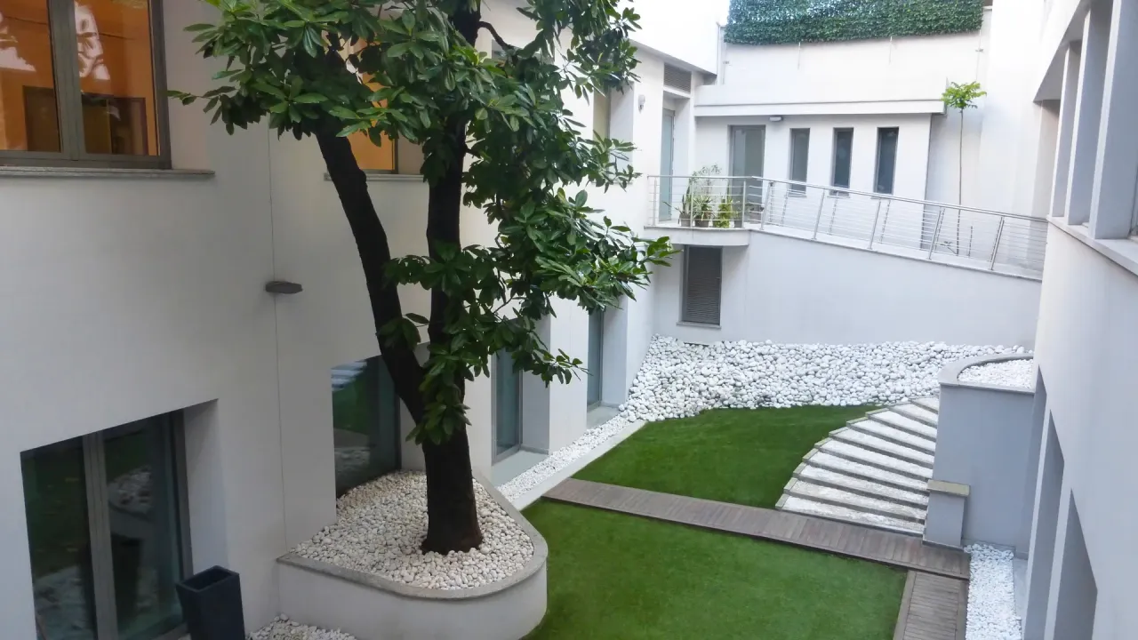Urban Hub is a newly built, modern office and showroom complex located in Viale Piceno 17, available for lease from Q4 2025. The property offers approx. 3,500 sqm of flexible office space arranged across multiple levels, complemented by 100 sqm of archive/storage areas. Two buildings, connected by a central block, overlook a private landscaped courtyard with lawn, flowerbeds and white stone paving—creating a quiet and prestigious setting.